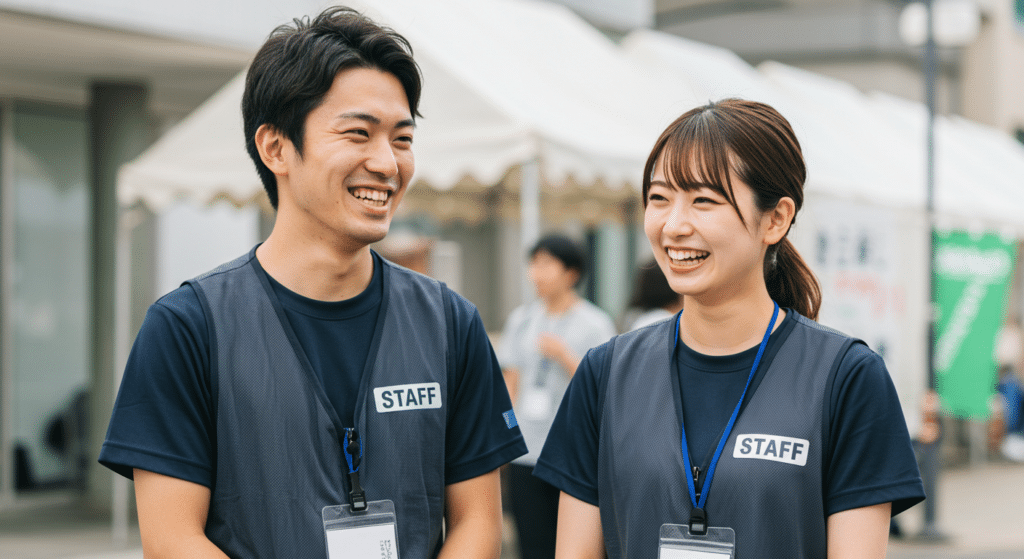 また、混雑時には人の流れをコントロールするため、声かけや誘導の工夫が求められます。服装面では、目立つ色のスタッフジャンパーや名札が支給されるケースが多く、参加者から一目でスタッフと分かるようにする配慮が必要です。